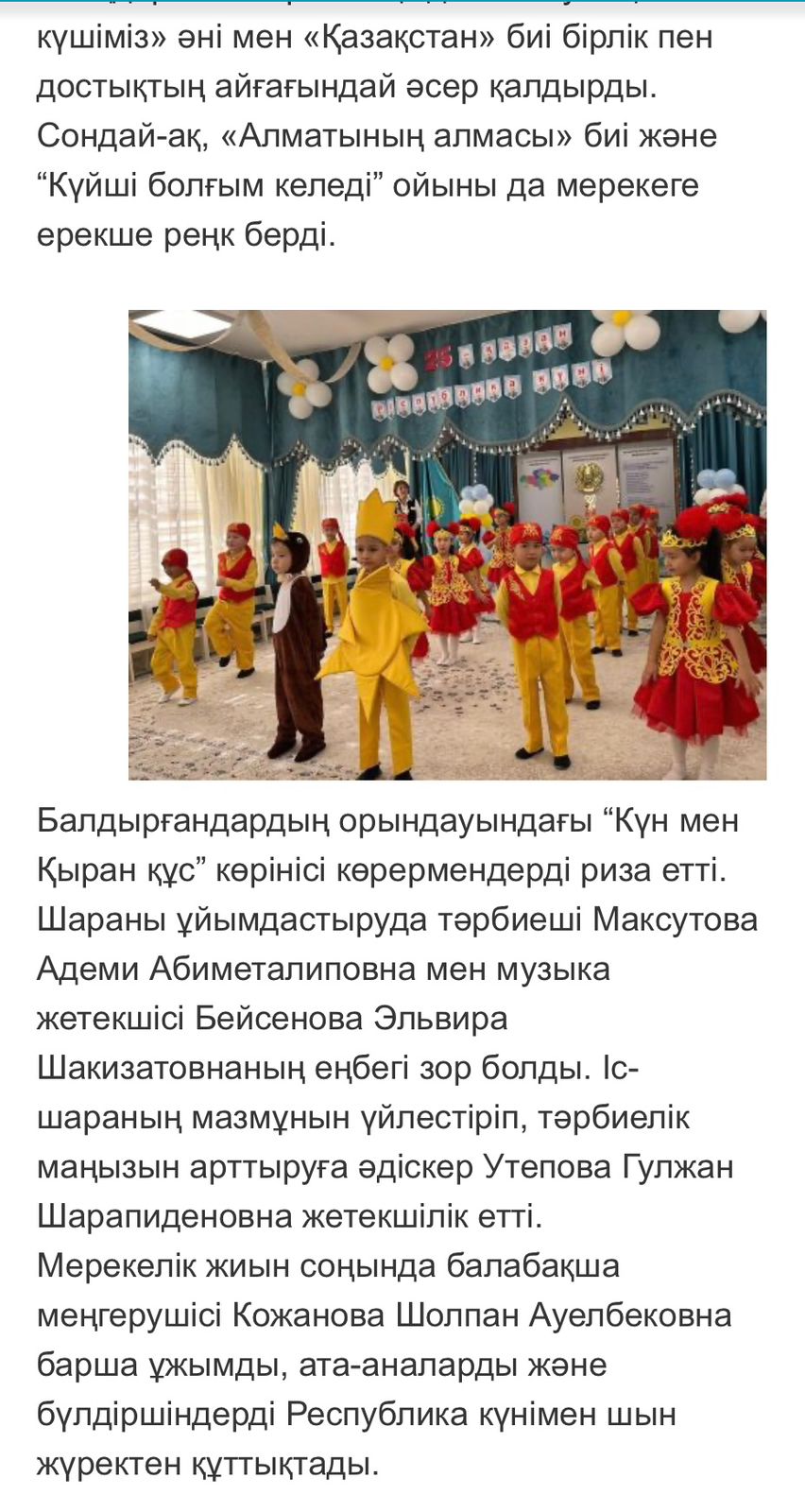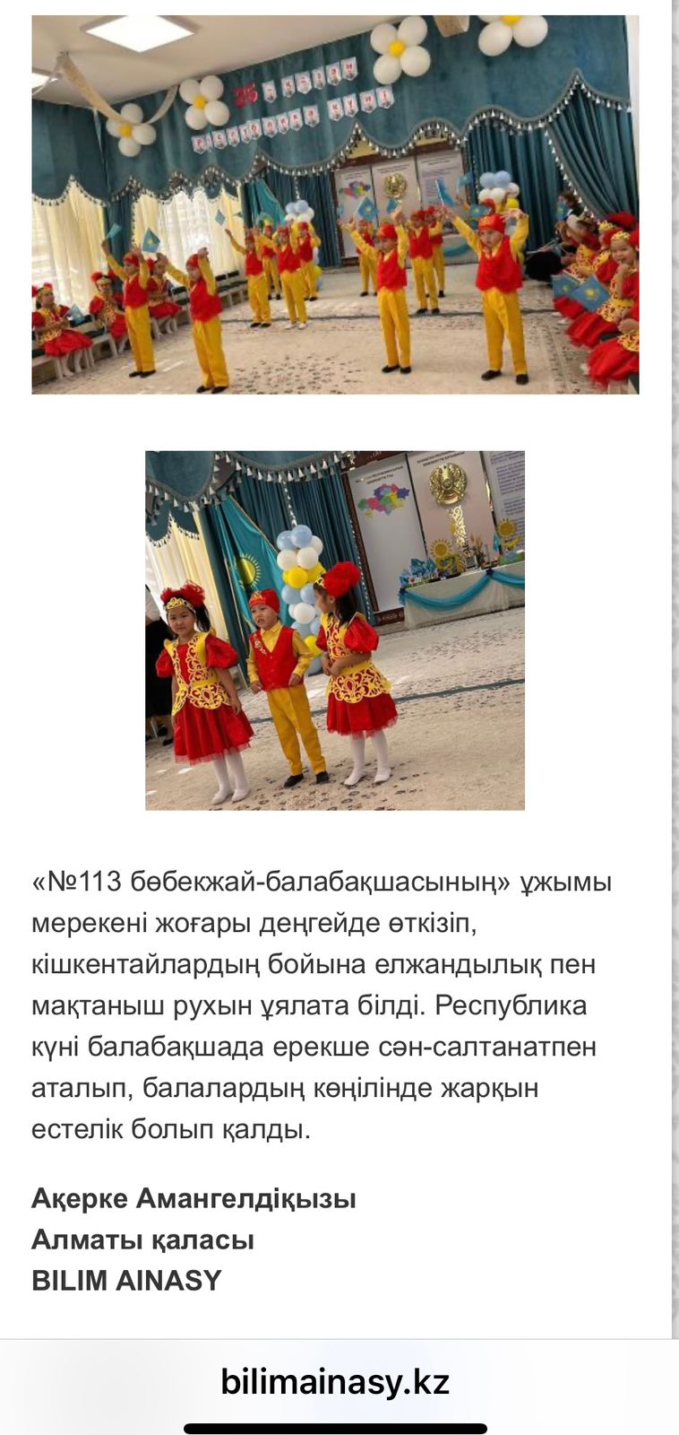 Республика күні қарсаңында балабақшада өткізілген «Қазақстан – туған елім!» атты мерекелік ертеңгілігіміз "Білім айнасы" республикалық басылымында жарық көрді!